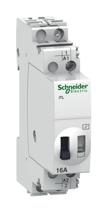 Fernschalter Acti 9 iTL. 1 Schließerkontakt, 1-polig, 16A, 230/240V AC oder 110V DC Impulssteuersignal. Fernschalter werden zum Schalten von Beleuchtungsstromkreisen mit einem oder mehreren Tastern eingesetzt: Glühlampen, NV-Halogenlampen usw. (ohmsche Lasten). Leuchtstofflampen, Entladungslampen usw. (induktive Lasten). Deaktivierung der Fernbetätigung z.B. für Wartungsarbeiten. Dieses Produkt entspricht IEC 669-1, IEC 669-2-2-2, IEC 60529, hat IP20 beim Öffnen, IP40 im Gehäuse und ist auf einer DIN-Schiene montierbar.