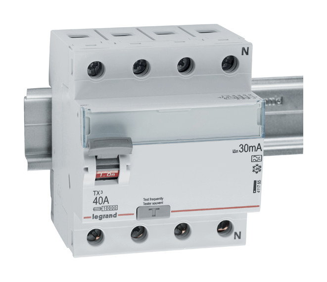 Legrand Fehlerstromschutzschalter TX3, Typ A, für Wechsel- und pulsierende Gleichfehlerströme. Nach VDE 0664-10, EN 61008-1, unverzögert , 4-polig , Bemessungsstrom In 40 A, Bemessungsfehlerstrom Idn 30 mA, Bemessungsspannung Un 400 VAC, Bemessungsfrequenz 50 Hz , Bemessungskurzschlussstrom 10 kA bei geeigneter Vorsicherung , Stoßstromfest bis 250 A, Befestigung auf Hutprofilschiene EN 60715 durch rastende Schnellbefestigungen, klare Information vorne auf jedem Gerät, eindeutige Schaltstellungsanzeige rot/grün am Schalthebel (verriegelbar), mit Beschriftungsfenster, mit Untersteckschutz zum sicheren Einführen des Leiters in Fahrstuhlklemme, Anbau von Hilfsgeräten möglich.