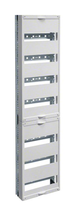 Verteilerfeld,univers Z,Höhe 1050mm,7-reihig,1-feldig,PE/N senkrecht. Innenausbau für Verteilerfelder Einbausätze für Verteiler nach Maßnorm DIN 43 870 zum Einbau in Zählerschränke System univers Z zur Stromkreisverteilung. Bestehend aus 250 mm breiten Feldern mit Traggerüst aus profiliertem Stahlblech Verteilerfelder im Rastermaßsystem mit Hutschienen 35*7,5 mm und fingersicheren PE/N-Klemmen in Stecktechnik. Abdeckhaube aus Kunststoff Höhe 300 mm oder 450 mm zur Einhaltung der Schutzisolierung, Schutzart und Berührungsschutz. Alle Hauben mit Plombierschieber zur Plombierung, integriertem Griff und 46 mm Geräteschlitz mit je 12 Platzeinheiten pro 150 mm Rasterns. Die Felder sind mit einem Rastsystem ausgestattet, das einen schnellen und einfachen Schrankeinbau ohne Werkzeug erlaubt.