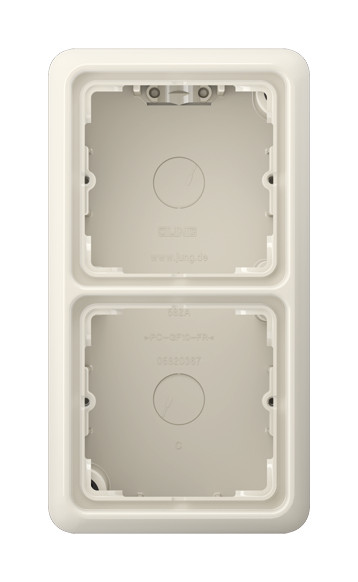 Aufputz-Kappe, 2fach, mit integrierter, flammwidriger Bodenplatte und angeformtem Rahmen, zum Einbau von Unterputz-Geräten mit ST-550-Zentralplatten und CD-500-Abdeckungen