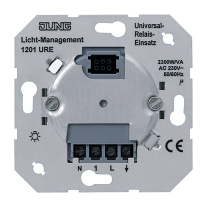 Relais-Einsatz 1-kanalig, Nennspannung: AC 230 V ~, 50/60 Hz, Anschlussleistung: Glühlampen 2300 W, HV-Halogenlampen 2300 W, Tronic-Trafos 1500 W, konventionelle Trafos 1000 W, Leuchtstofflampen 1200 W (unkompensiert), 920 W (parallelkompensiert) und 2300 W (Duo-Schaltung), N-Leiter erforderlich| Hersteller / Marke | JUNG |