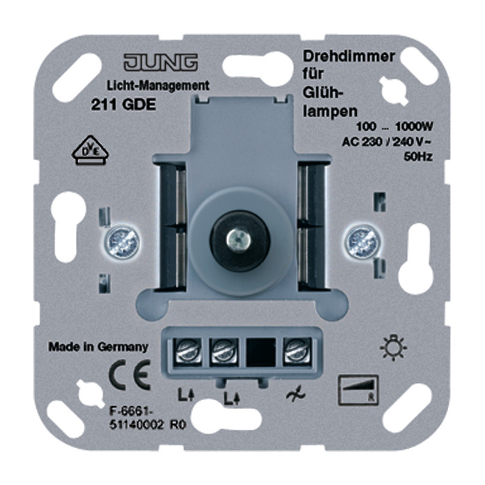 Drehdimmer, mit Druck-Wechselschalter, Nennspannung: AC 230/240 V ~, 50 Hz, Anschlussleistung: 230/240-V-Glüh- und -Halogenlampen 100 bis 1000 W, Mischlasten der spezifizierten Lastarten, Mindestlast: 100 W, maximaler klemmbarer Leistungsquerschnitt: 2 x 2,5 mm² oder 1 x 4 mm², Wechselschaltung über mechanische Wechselschalter, Wechselschaltung mit 2 Dimmern nicht möglich, Anschluss von Trafos nicht zulässig| Hersteller / Marke | JUNG |
