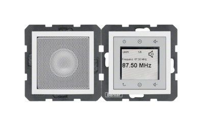 Radio Touch, mit Lautsprecher, S.1/B.3/B.7, polarweiß glänzend. Radio Touch Stereo-Up-Radio zum Empfang von UKW-Sendern, zweiteiliger Aufbau aus Radio- und Lautsprechermodul jeweils zur Montage in Gerätedose nach DIN 49073, Montage in senkrechten oder waagerechten Kombinationen oder unabhängig (Lautsprecher-Anschlussleitung vorsehen), Anschluss für zweiten Lautsprecher am Radiomodul, Touch-Bedienung über Grafikdisplay mit kapazitiven Sensorflächen, mit Nebenstellenanschluss zum Einschalten parallel zur Beleuchtung, RDS, 8 Senderspeicher, Uhrzeit- und Datumsanzeige, Weckfunktion. Radio Touch, mit Lautsprecher, S.1/B.3/B.7, polarweiß glänzend. Radio Touch Stereo-Up-Radio zum Empfang von UKW-Sendern, zweiteiliger Aufbau aus Radio- und Lautsprechermodul jeweils zur Montage in Gerätedose nach DIN 49073, Montage in senkrechten oder waagerechten Kombinationen oder unabhängig (Lautsprecher-Anschlussleitung vorsehen), Anschluss für zweiten Lautsprecher am Radiomodul, Touch-Bedienung über Grafikdisplay mit kapazitiven Sensorflächen, mit Nebenstellenanschluss zum Einschalten parallel zur Beleuchtung, RDS, 8 Senderspeicher, Uhrzeit- und Datumsanzeige, Weckfunktion.