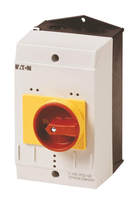 Isolierstoffgehäuse für PKZM0 +Drehgriff, rot/gelb, Schutzart IP65, glasfaserverstärktes Polycarbonat, Gehäuseunterteil RAL 9005, schwarz/Gehäuseoberteil RAL 7035, hellgrau, Metrische Vorprägungen oben, unten, in der Rückwand,Leitungsdurchsteckmembran, Steuerleitungseinführung| Manufacturer / Brand | EATON |