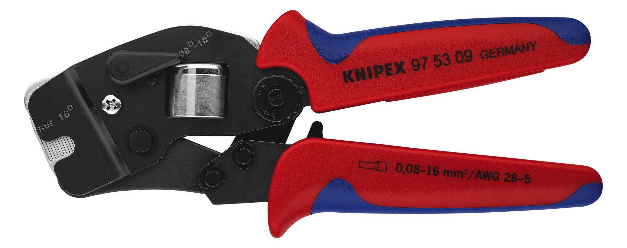 Zum Verpressen von Aderendhülsen nach DIN 46228 Teil 1 + 4. Selbsteinstellende Anpassung auf die gewünschte Aderendhülsengröße: keine Crimpfehler durch Verwendung des falschen Crimpeinsatzes. Frontale Einführung der Aderendhülsen in das Werkzeug. Gleichbleibend hohe Crimpqualität durch Zwangssperre (entriegelbar). Crimpdruck ist werkseitig präzise eingestellt (kalibriert). Kraftverstärkung durch Kniehebel für ermüdungsarmes Arbeiten. Hoher Bedienkomfort durch handliche Bauform und geringes Gewicht. Verpressung von 0,08 bis 10,0 mm² und 16,0 mm² in einem Profil. Mit Wahlhebel zur Einstellung des Crimpbereichs 0,08 bis 10 oder 16,0 mm². Auch passend für Twin-Aderendhülsen bis 2 x 10 mm², aber kleiner als Ø 6,6 mm (z. B. KNIPEX Art.-Nr. 97 99 377). Chrom-Vanadin-Elektrostahl in Sondergüte, ölgehärtet