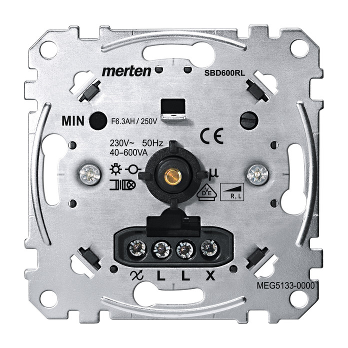 Für dimmbare, gewickelte Trafos, Glühlampen und 230 V-Halogenlampen (induktive/ohmsche Last). (Phasenanschnitt). Mit Druck-Wechselschalter. Zu komplettieren mit: Zentralplatte mit Drehknopf System M MEG5250-03xx/-04xx/-06xx Zentralplatte mit transparenter Abdeckung und Drehknopf M-Creativ MEG5250-3500. Zentralplatte mit Drehknopf System Design MEG5250-60xx, System Fläche MEG5250-40xx/-41xx/-42xx Hinweis: Informationen zum Thema Dimmen von LED Leuchtmittelnerhalten Sie im Internet unter Merten Dimmertest. http://www.merten.de/Dimmer-Test.dimmertest.0.html. Ausführung: 40-600 W/VA.| Manufacturer / Brand | MERTEN |